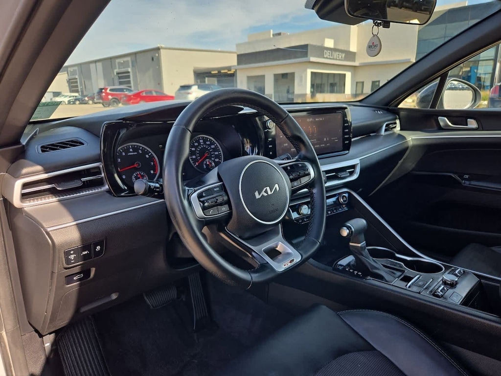 6 Speakers, Apple CarPlay & Android Auto, Auto High-beam Headlights, Cloth/Leatherette Seat Trim, Front Bucket Seats, Front Center Armrest, Fully automatic headlights, Heated Front Bucket Seats, Navigation System, Power driver seat, Power steering, Power windows, Radio: AM/FM/MP3 Audio System, Remote keyless entry, Speed control, Split folding rear seat, Steering wheel mounted audio controls. CARFAX One-Owner. 2022 Kia K5 GT-Line